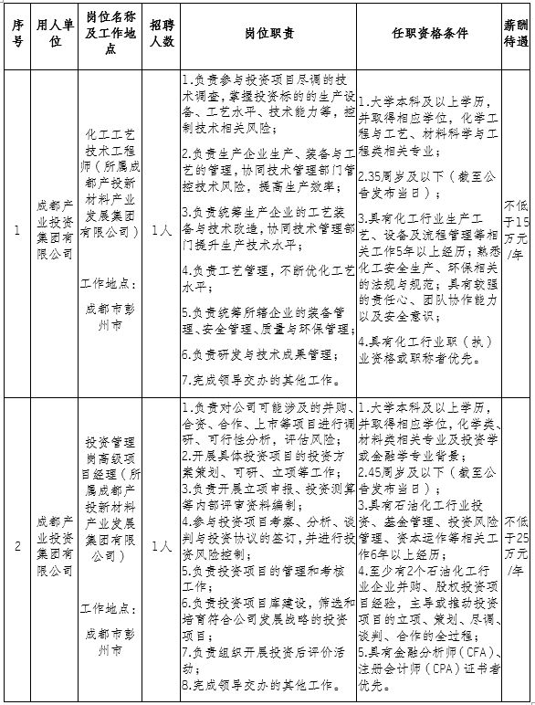 (九)应聘人员需认真阅读本公告,凡投递简历人员即视为已知晓并认同本公告全部内容。其他媒体平台转载的与本公告内容不一致的,以成都产业投资集团有限公司官网(https://www.cdcyjt.com/)发布的公告为准。